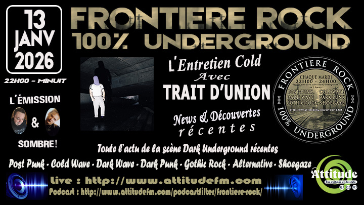Frontière Rock 22h midnight every Tuesday evening from 22h to midnight, dive into the dark and alternative world of Dark, Alternative, Post Punk, Coldwave, Gothic Rock, Darkwave, Deathrock, New Wave, Dark Punk, Shoegaze music...
