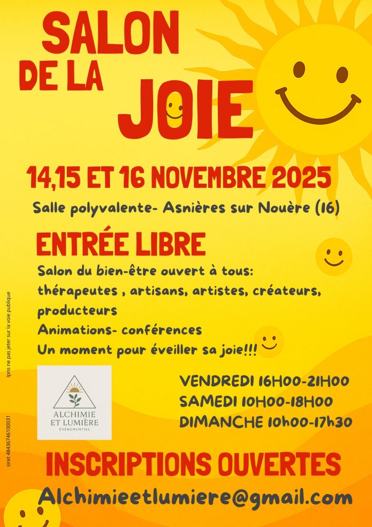 « Le Salon de la Joie arrive à Asnières-sur-Nouère, à seulement 15 minutes d’Angoulême ! Vendredi 14 novembre de 16h à 21h, Samedi 15 et dimanche 16dès 10h,